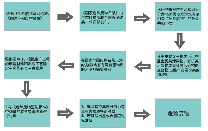 依据由环境保护部联合国家发改委、公安部发布自2021年1月1日起开始施行的《国家危险废物名录》和《危险废物鉴别标准-通则》,结合住建部、环保部、科技部于2009年2月28日联合发布的《城镇污水处理厂污泥处理处置及污染防治技术政策(试行)》,五步即可判定污水污泥是否属于危险废物,如下图所示: