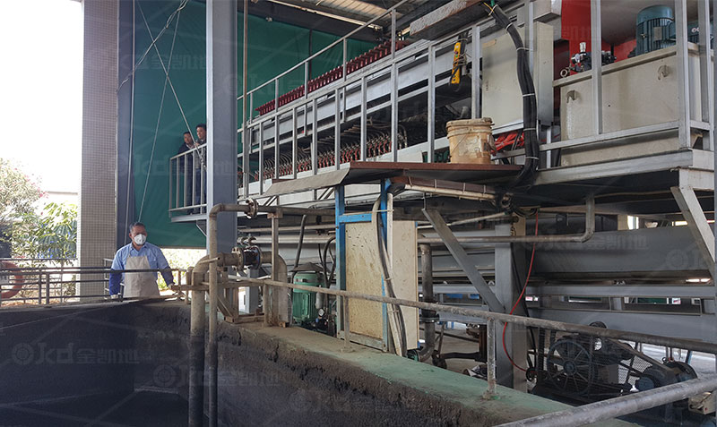 高压隔膜压榨水泵开始停止运转并卸压。茄子污视频在线观看可以卸料。机座端液压缸逐渐卸压,活塞杆开始向后移动并把推板拉回至初始位置,接液翻板自动打开,各滤板不再处于闭合、密封状态。拉板机械手由变频电机驱动至第一块滤板进行取板,在取到板时变频电机开始反转将滤板拉到推板端,滤饼在重力的作用下自动脱落。取拉板机械手重复以上动作,直到将所有滤板上的滤饼清理干净,取拉板机械手回到初始位置。接液翻板自动闭合卸料结束,进入下一个环节,自动高压洗布,自动洗布架由电机驱动至两滤板中间空隙处停止待命,取板机械手由变频器驱动变频电机,将第一块滤板拉至洗布架下方位置停止、待命,水洗杆向下移动同时启动高压清洗滤布水泵,水洗杆向下将滤布上残留的污泥用8Ma的水压进行冲洗,洗布架及拉板机械手重复以上动作,直到将所有滤板清洗一遍,洗布架及取拉板机械手回到初始位置,结束洗布流程,茄子污视频在线观看进入下一个工作循环。